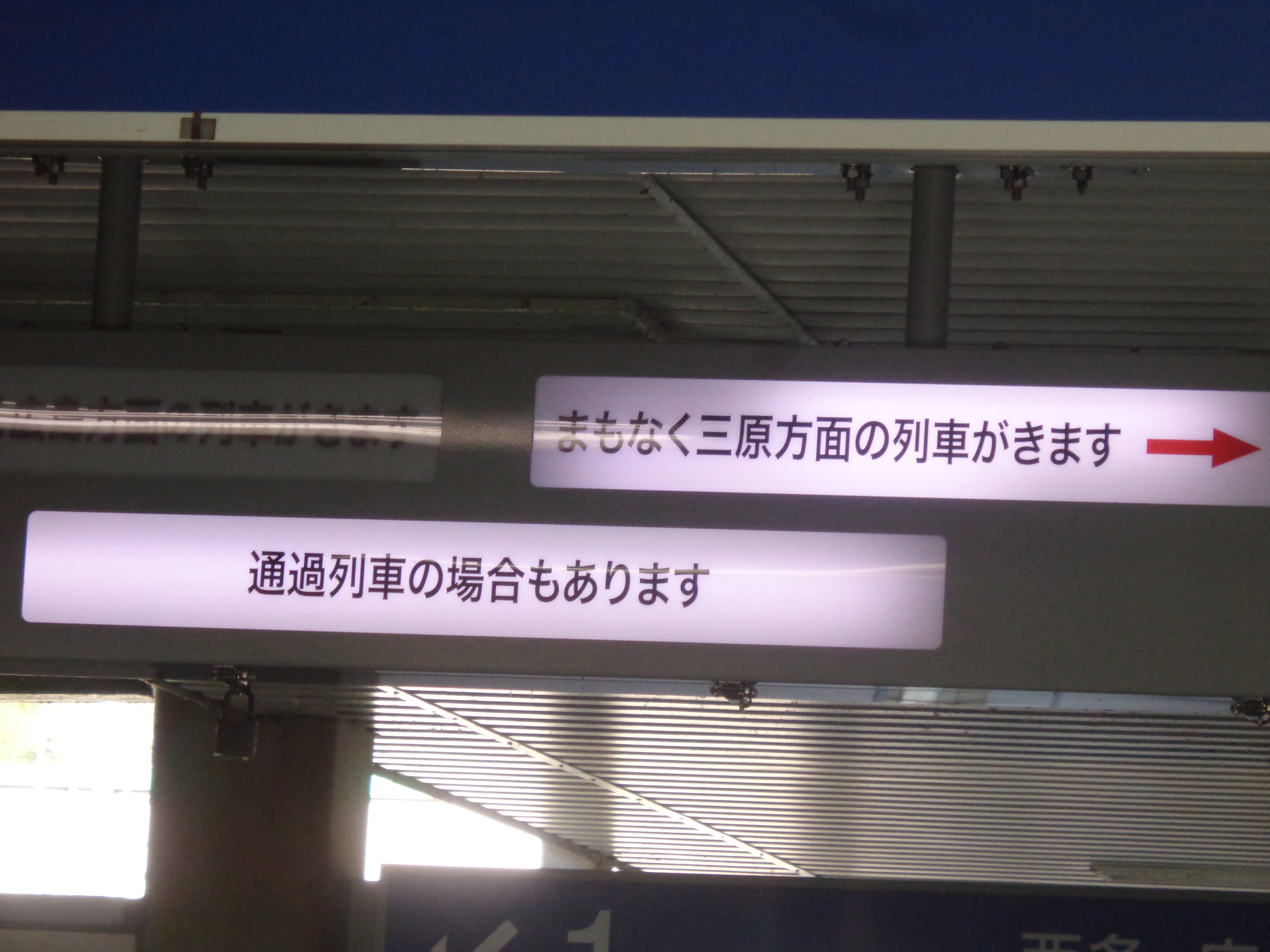 この駅の改札前にはこのような看板があります。電光掲示板ではなく、ランプがついた表示器です。「通貨列車の場合もあります」というタイプが珍しいですね。通過列車はこのあたりでは貨物列車が中心と思われます。