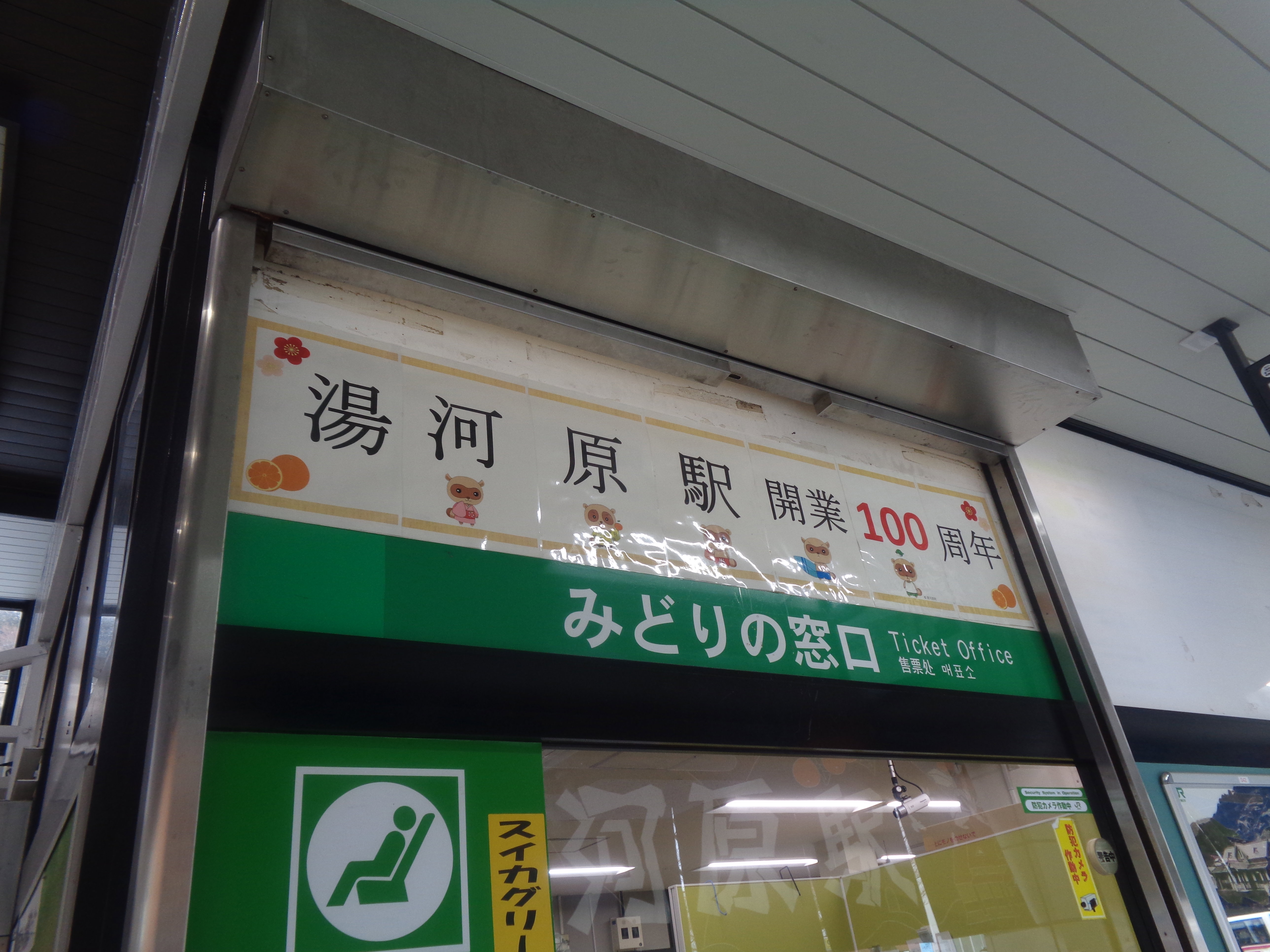 みどりの窓口です。訪問時は開業100周年の時期に近かった(1924/10/1開業)のため、100周年と書かれていました。なお訪問日時点ですでに約半年が過ぎ去っていました。