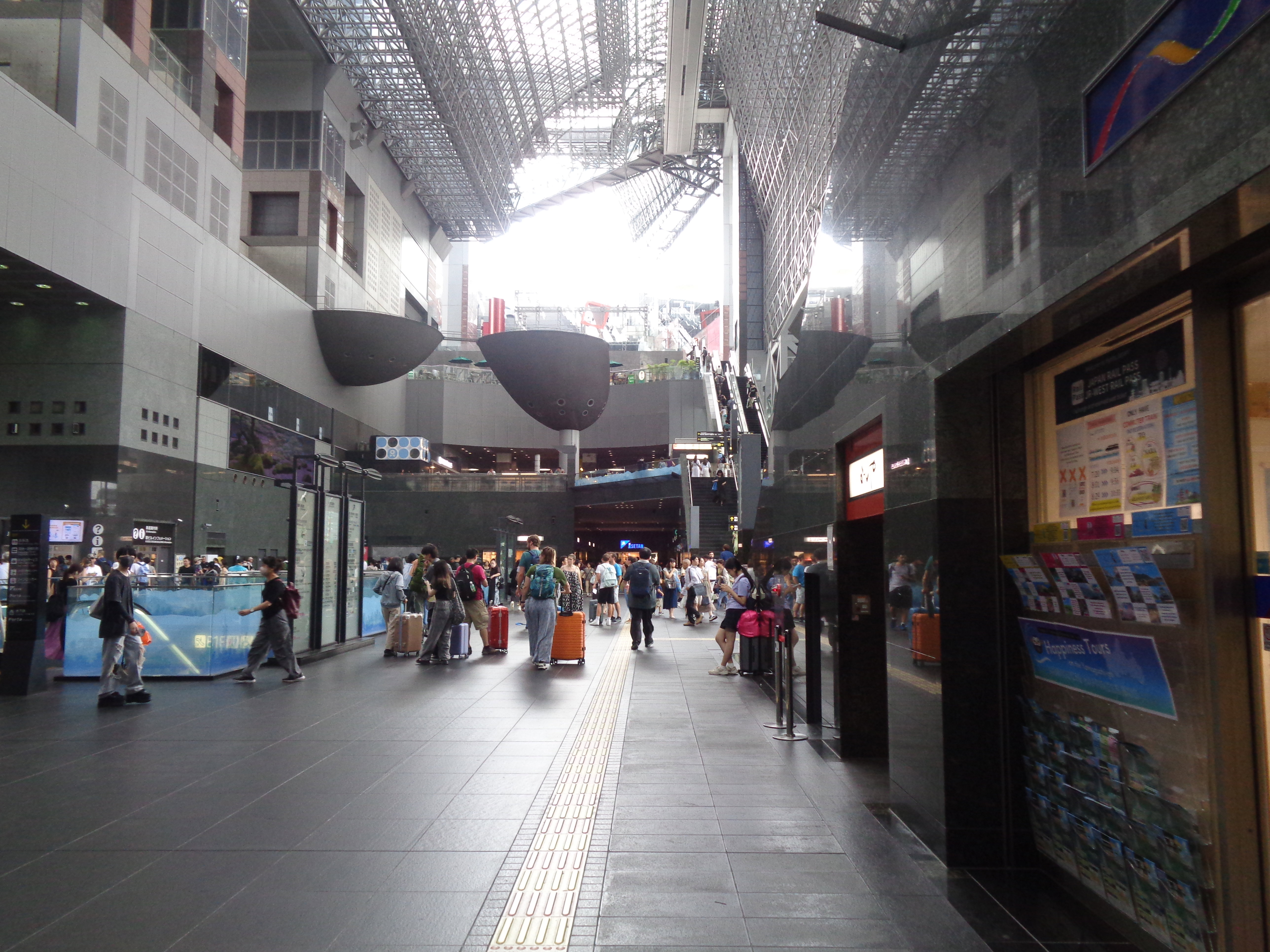 京都駅内の通路です。特徴的な建築となっています。この駅は京都観光に来られる多くの観光客が利用される駅で、外国人従業員が現地の言語で外国人観光客を案内するなど、インバウンド対応も張ってインしていました。