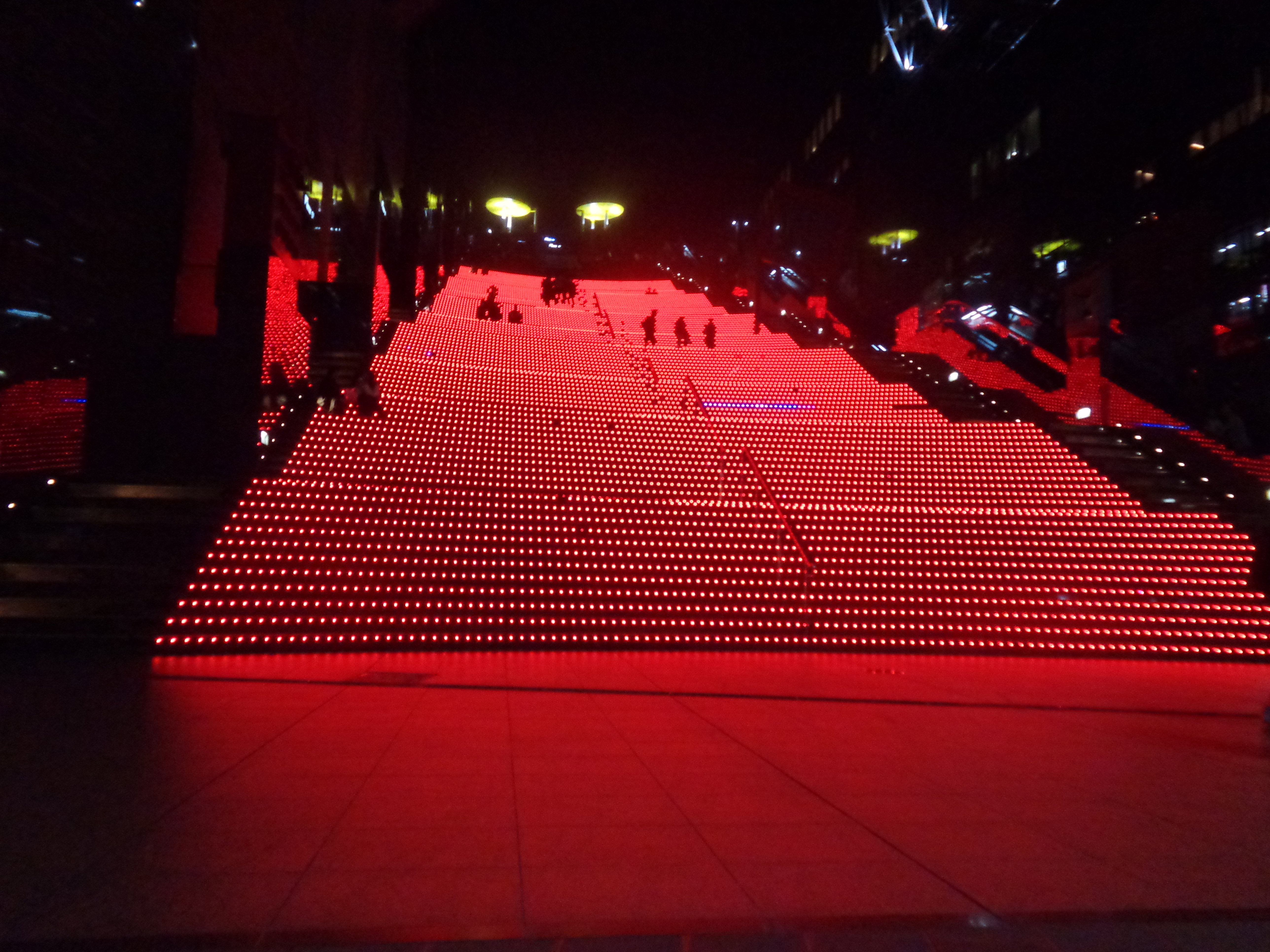 外階段は迫力のあるイルミネーションがきれいです。赤・青・緑・紫と色が交互に変わっていくため、SNS映えします。この階段はかなり長いほか、夜は暗くライトが眩しいので上り下りの際には足元に注意してほしいです。足を踏み外すとかなり危険です。