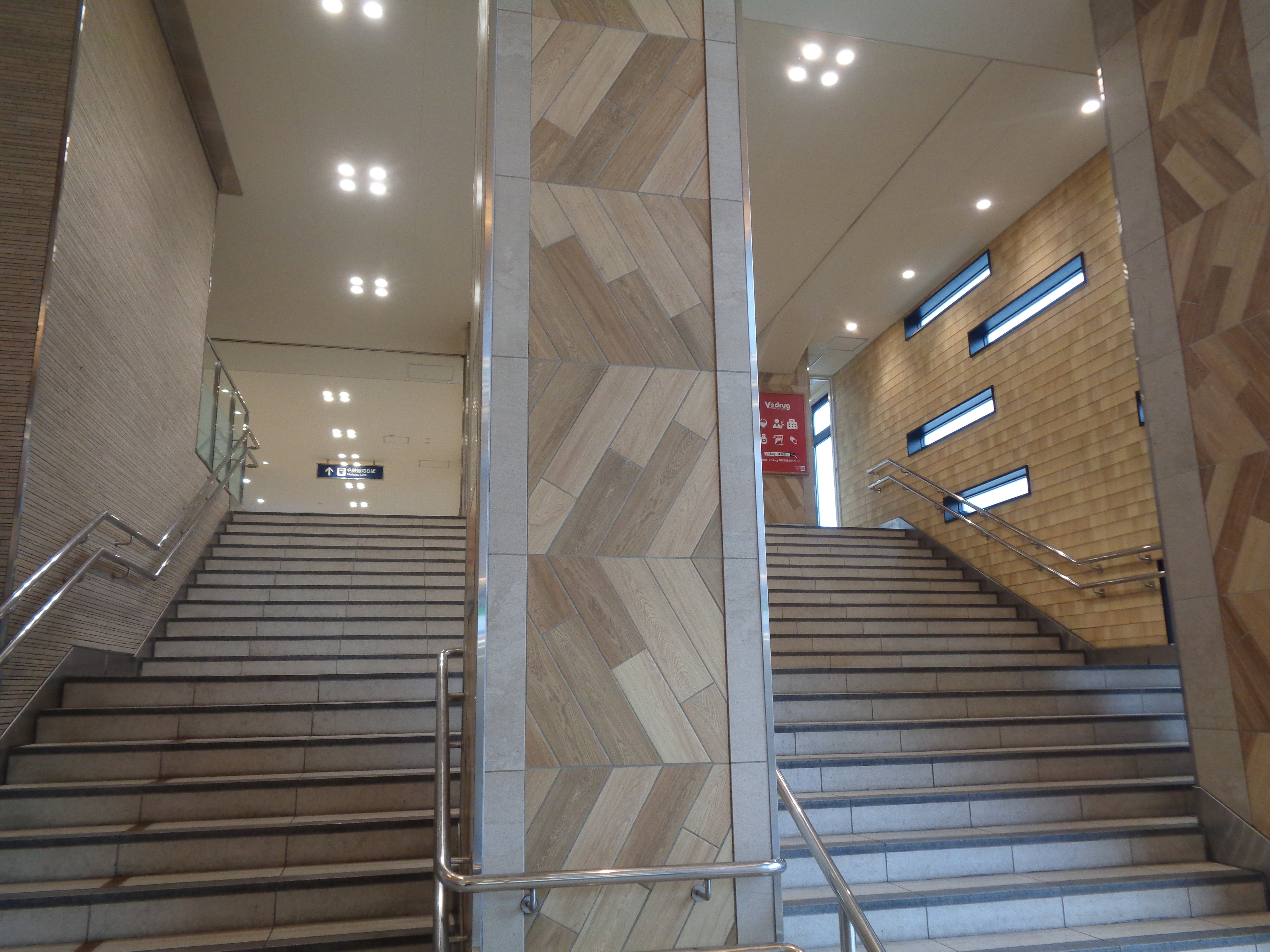 入口です。階段しかないように見えますが、左側にエレベーターが設置されています。リニューアル工事が行われており、きれいな状態になっています。これまでの名鉄のイメージにはなかった新しい設計が取り入れられていました。