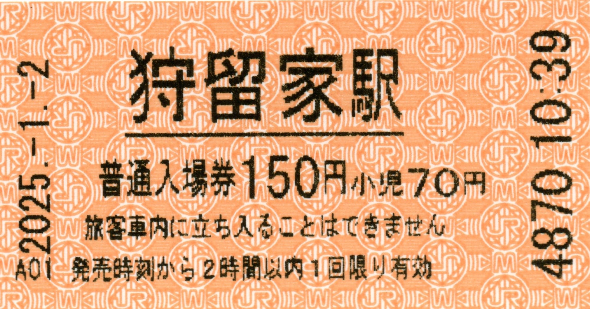 狩留家駅にある簡易券売機では入場券や乗車券などを購入することができます。最近JR西日本で更新が進んでいるようで新型簡易券売機では入場券が購入可能になっています。よくあるオレンジ色のきっぷですが、無人駅でも入場券が購入できる点は非常に評価できます。
