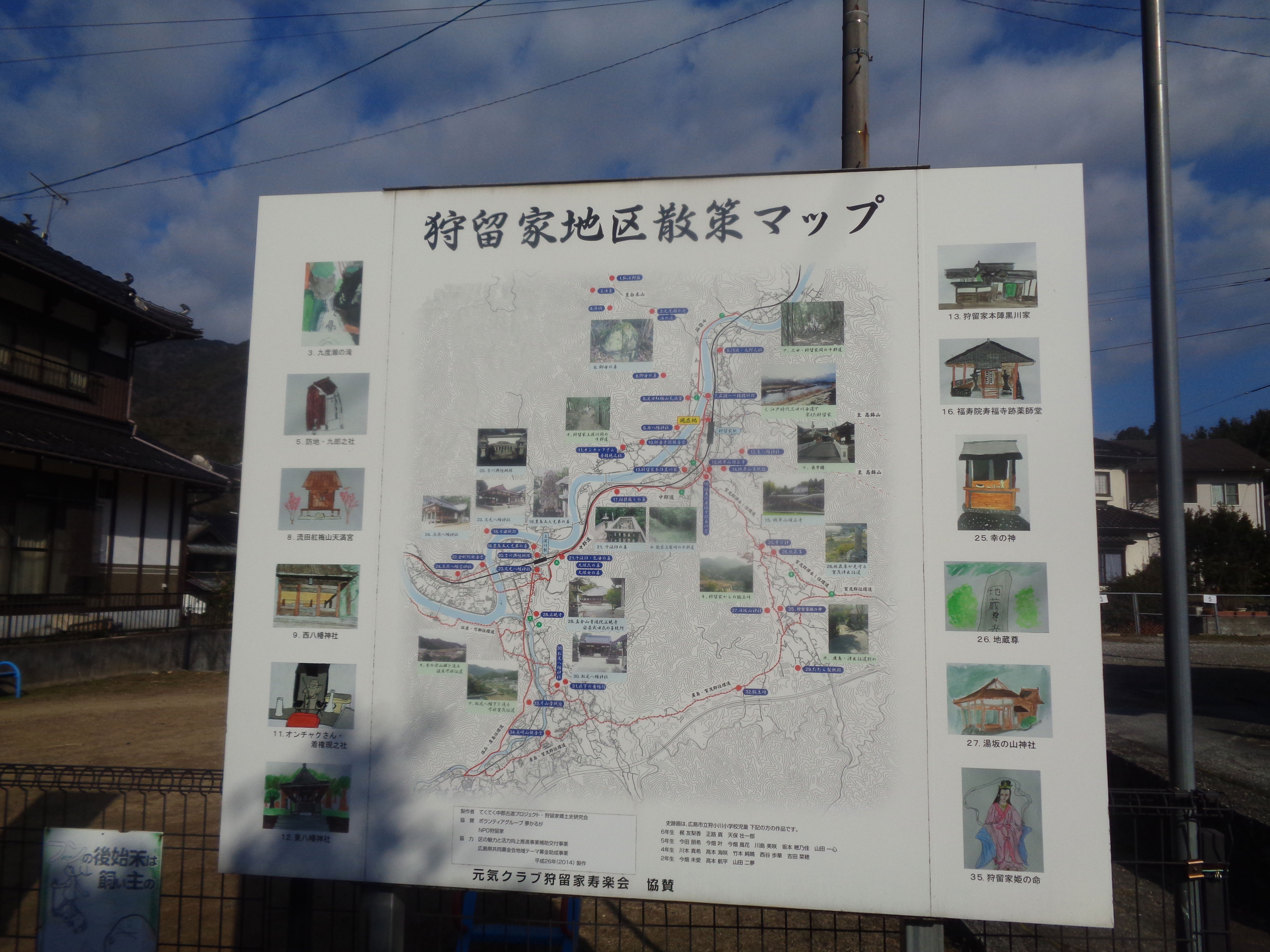 駅舎前には狩留家地区散策マップという看板がありました。このあたりも安佐北区で住宅地ですが滝や神社などに徒歩で向かえるようです。今度来た際にはじっくり観光してみたいです。