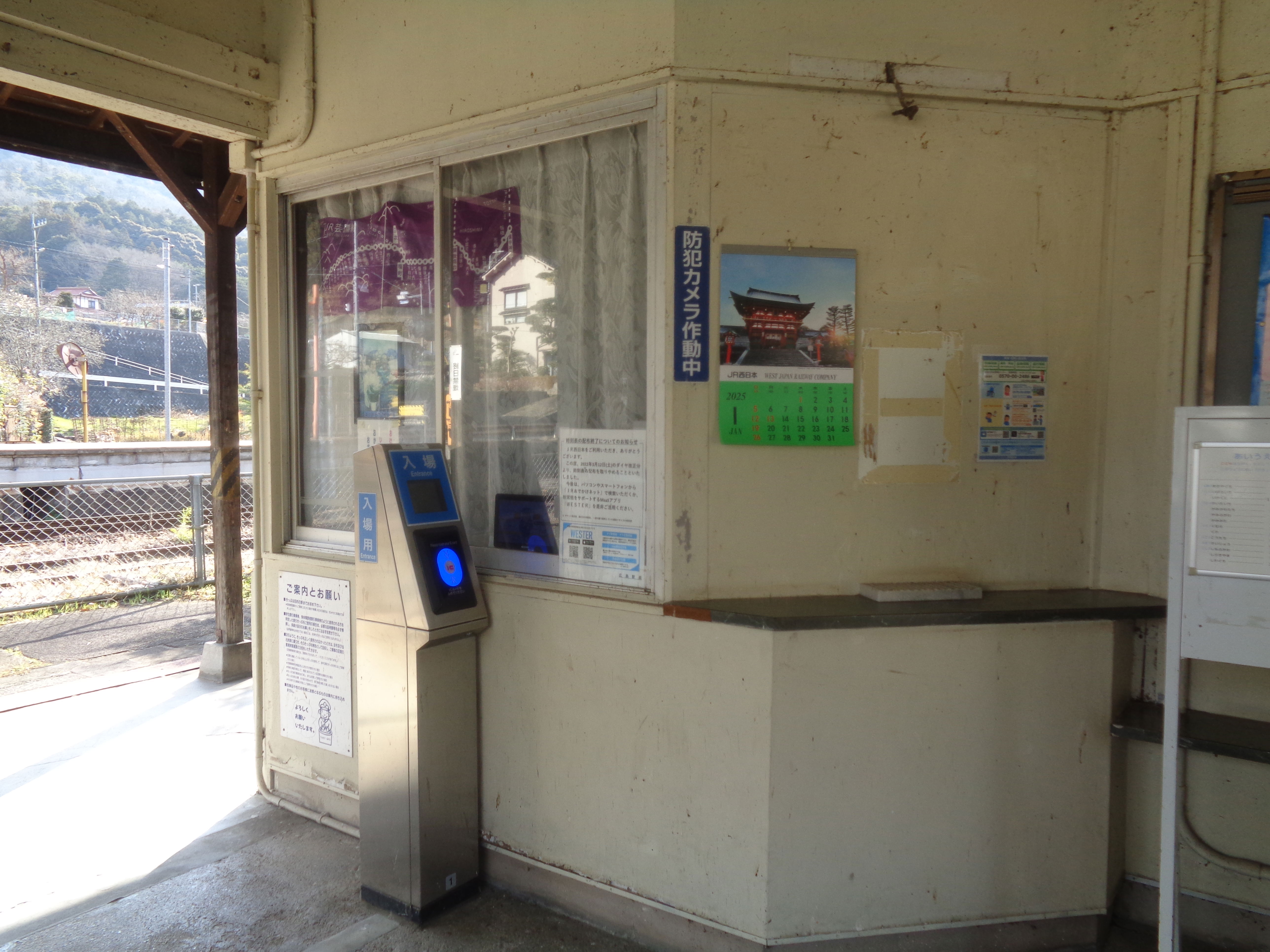 改札口の様子です。ICカード専用の自動改札機があります。窓口はかつてはあったようですが現在は廃止されており板が貼られているほか、カーテンが閉められています。ちなみに改札窓口の中にはモニターが設置されており関西万博の広告が流れていました。