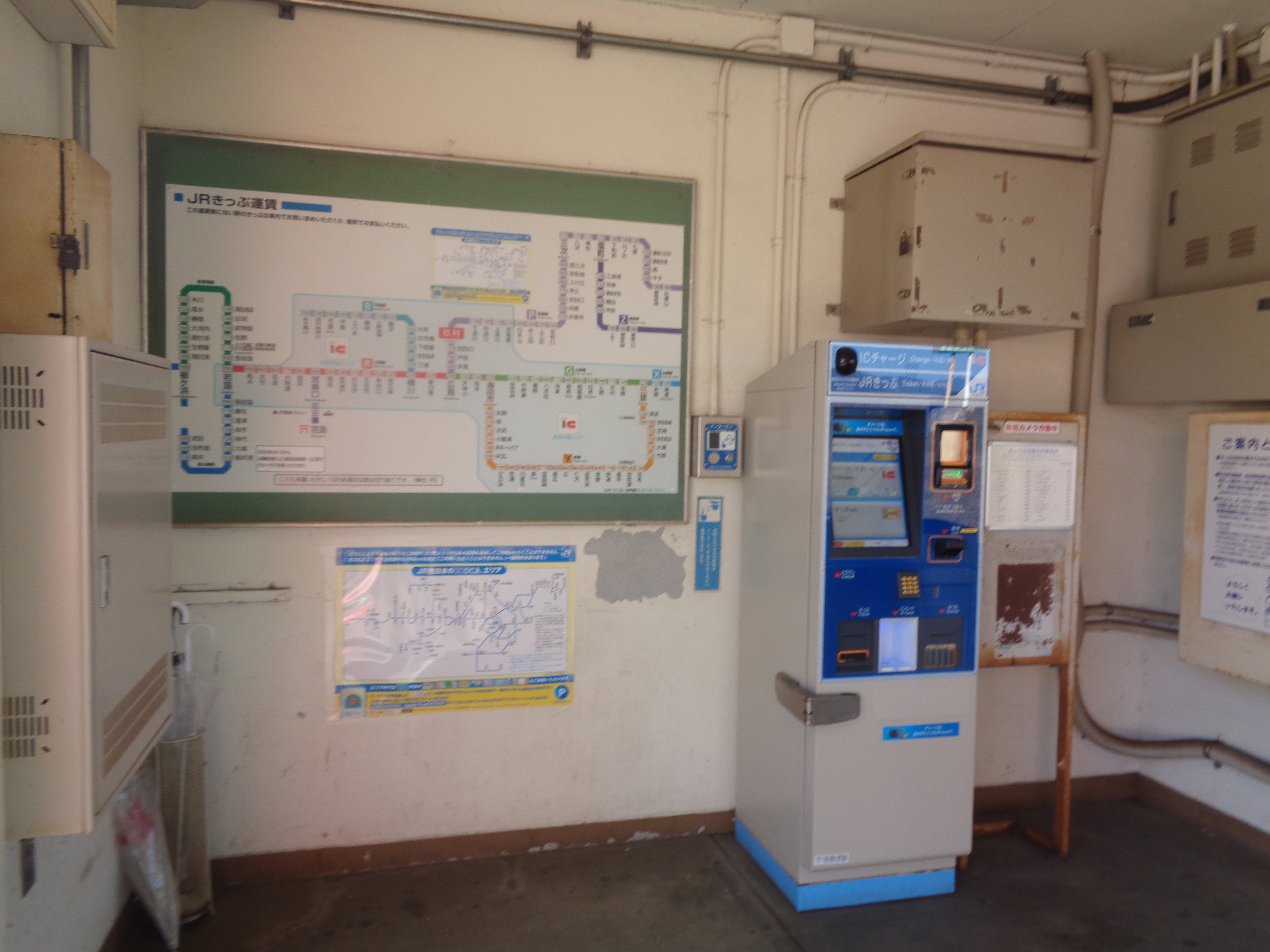 券売機と運賃表です。駅舎内部はコンクリート製で、様々な配線や機械類が目立っています。冬に来たため、寒さがかなり厳しいです。ICカード対応圏内ですので、簡易券売機でもチャージすることができます。芸備線でも一部区間でICカードが使えて便利になりました。