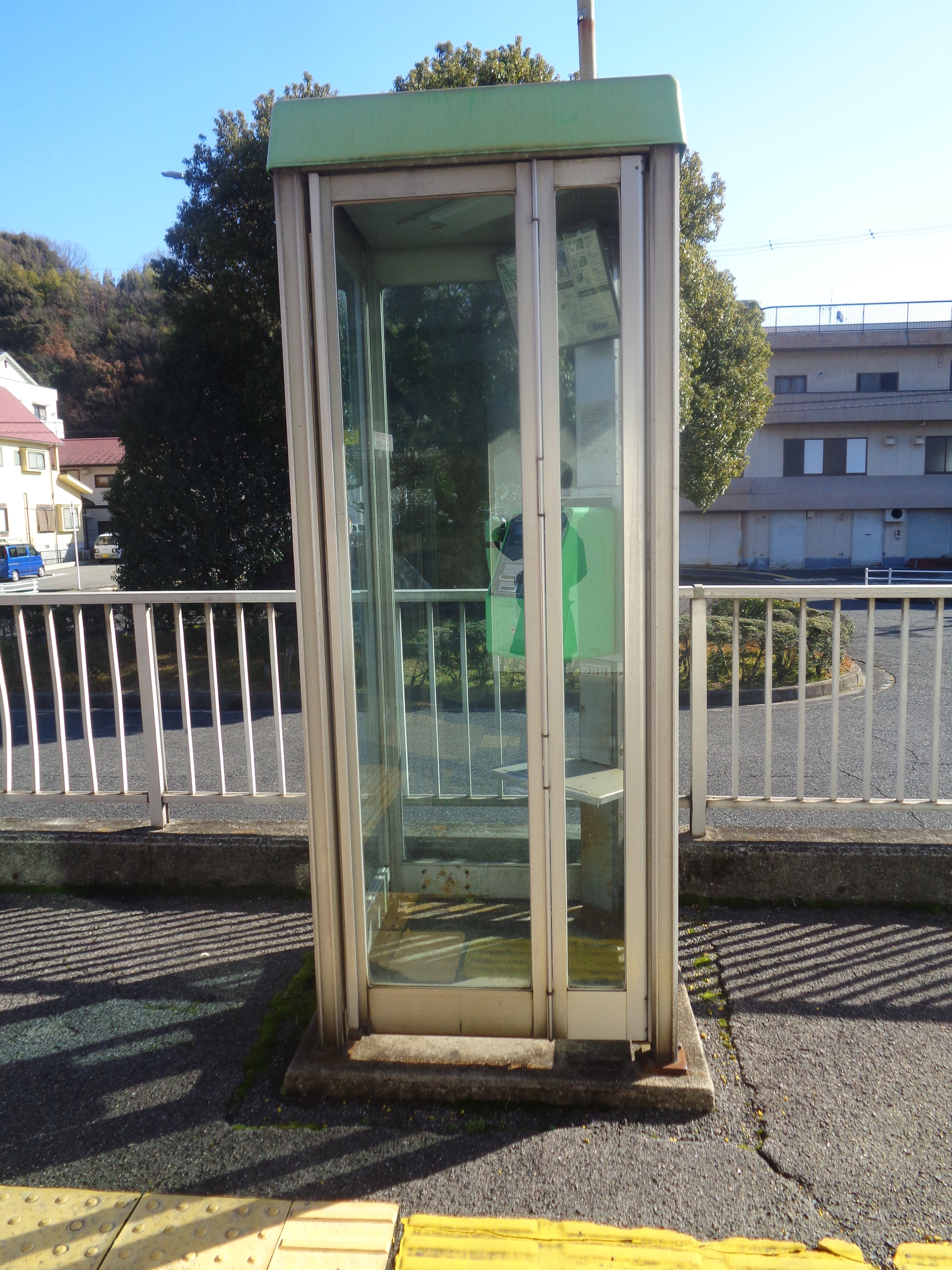 公衆電話です。近年減少しつつあるようですが、駅前では現役でした。電話ボックスに入っており立派な状態で運用されているようです。なお先述した通り駅自体は川が近いため、高台に設置されています。