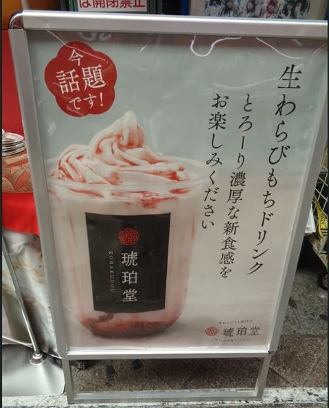 つづいて、「琥珀堂」というお店です。このお店は、わらび餅を販売しています。画像にもある通りのドリンクの商品も取り扱われているようです。